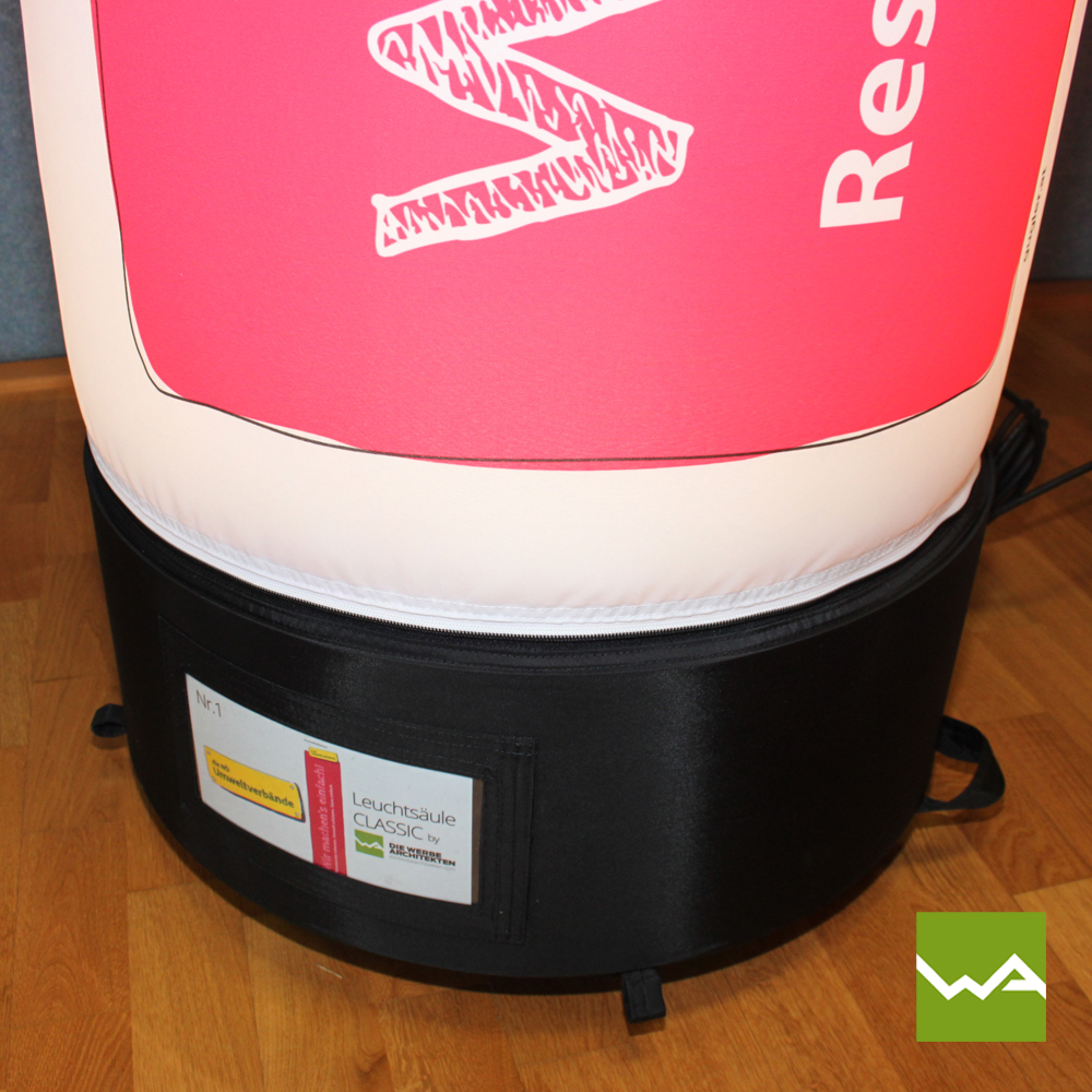 Jede unserer aufblasbaren Werbesäulen wird mit unserem bewährten Sockelsystem ausgeliefert. In diesem Sockel befindet sich sowohl das Gebläse als auch eine energiesparende Kaltlichtbeleuchtung. Zur Verwendung der Leuchtsäule muss lediglich der Reißverschluss des Sockels geöffnet und das Kabel am Strom angeschlossen werden. Innerhalb weniger Sekunden bläst sich die Werbesäule auf und entfaltet so ihre Werbewirksamkeit. Ist die aufblasbare Leuchtsäule gerade nicht in Verwendung, bildet der Sockel in Kombination mit dem Deckel eine praktische Transportbox.