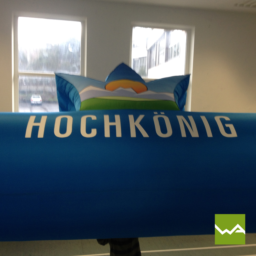 Wenige Wochen von dem Beginn der neuen Skisaison wurden wir vom Skigebiet Hochkönig bezüglich eines neuen, aufblasbaren Werbebogens kontaktiert. Dieser Werbebogen sollte jedoch nicht die typische Standardform besitzen, sondern eine individuell an das Logo des Skigebietes angepasste Sonderform. Das Logo des Skigebiets Hochkönig besteht aus einer rechteckigen Fläche mit Schriftzug „Hochkönig“ sowie einer darüber platzierten Krone. Mit diesen Anforderungen machten wir uns sofort an die Arbeit und erstellten eine 3D Illustration, um dem Kunden unsere Vorstellungen optimal präsentieren zu können. Dieser war damit sehr zufrieden und gab uns das OK für den Produktionsstart.