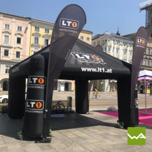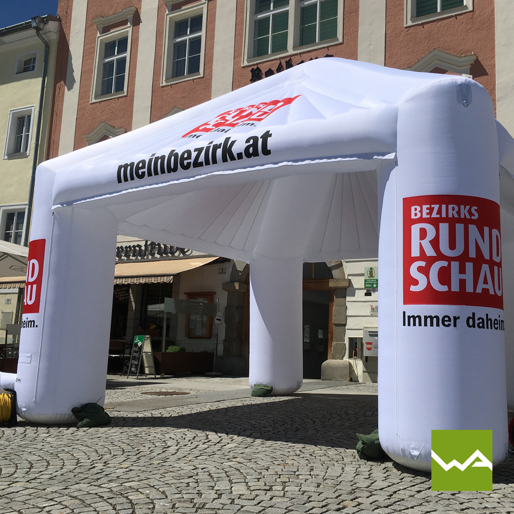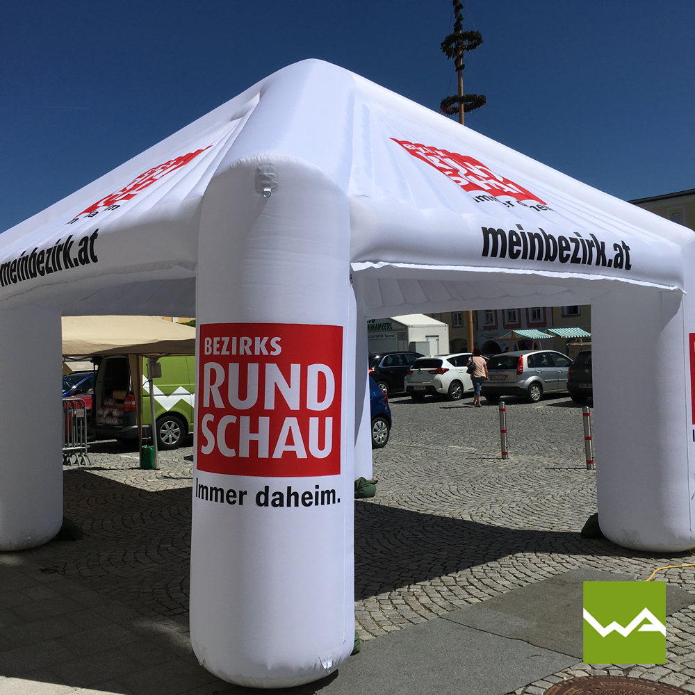 Inflatable advertising tents have been an integral part of the advertising world for years and are indispensable at trade fairs and for all kinds of promotional activities. Promotional tents are available in various sizes, impress with their extremely high quality and durability and are manufactured individually according to customer requirements. The use of the highest quality materials guarantees a quick and easy assembly with a low weight and pack size. There are also various types of side walls to choose from, which of course can also be branded. For unmistakable advertising appearances, there is the possibility of realizing individual roof structures for inflatable event tents. Due to the different materials, special customer requests can be realized, which makes an inflatable tent a unique eye-catcher at every event.