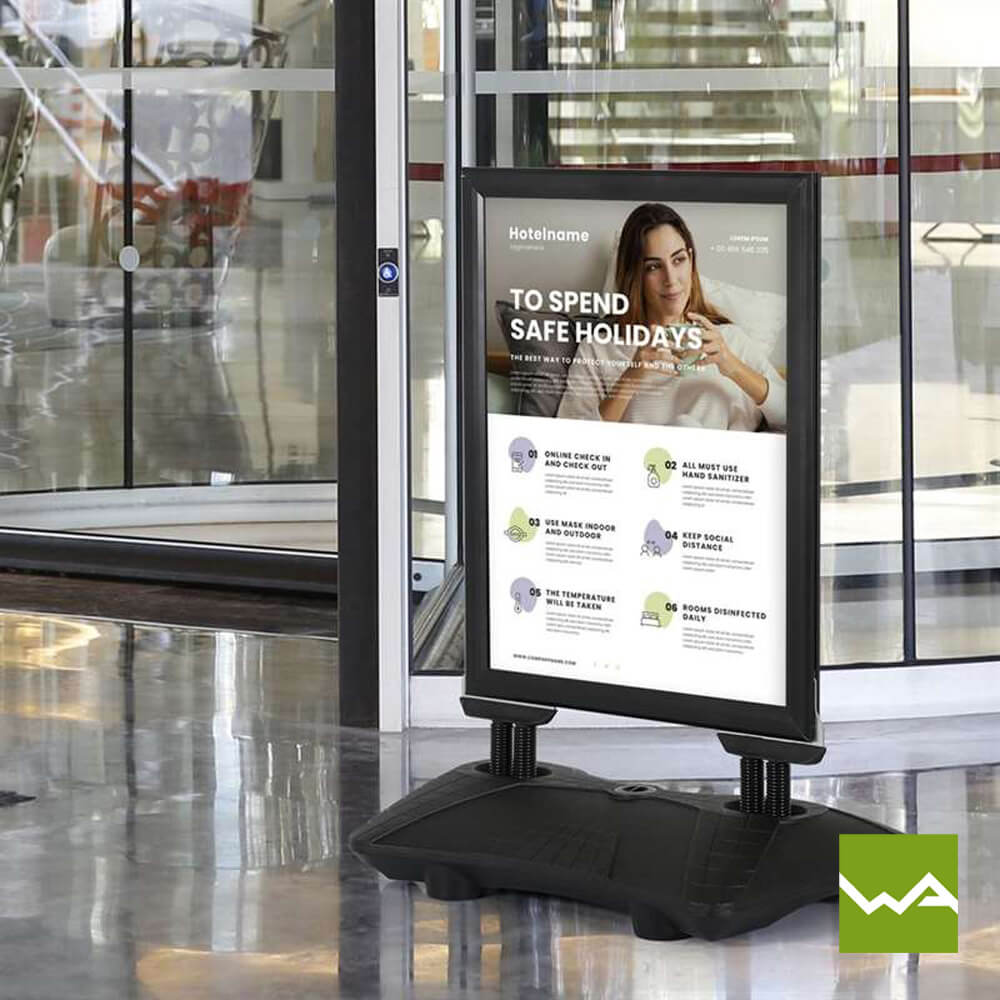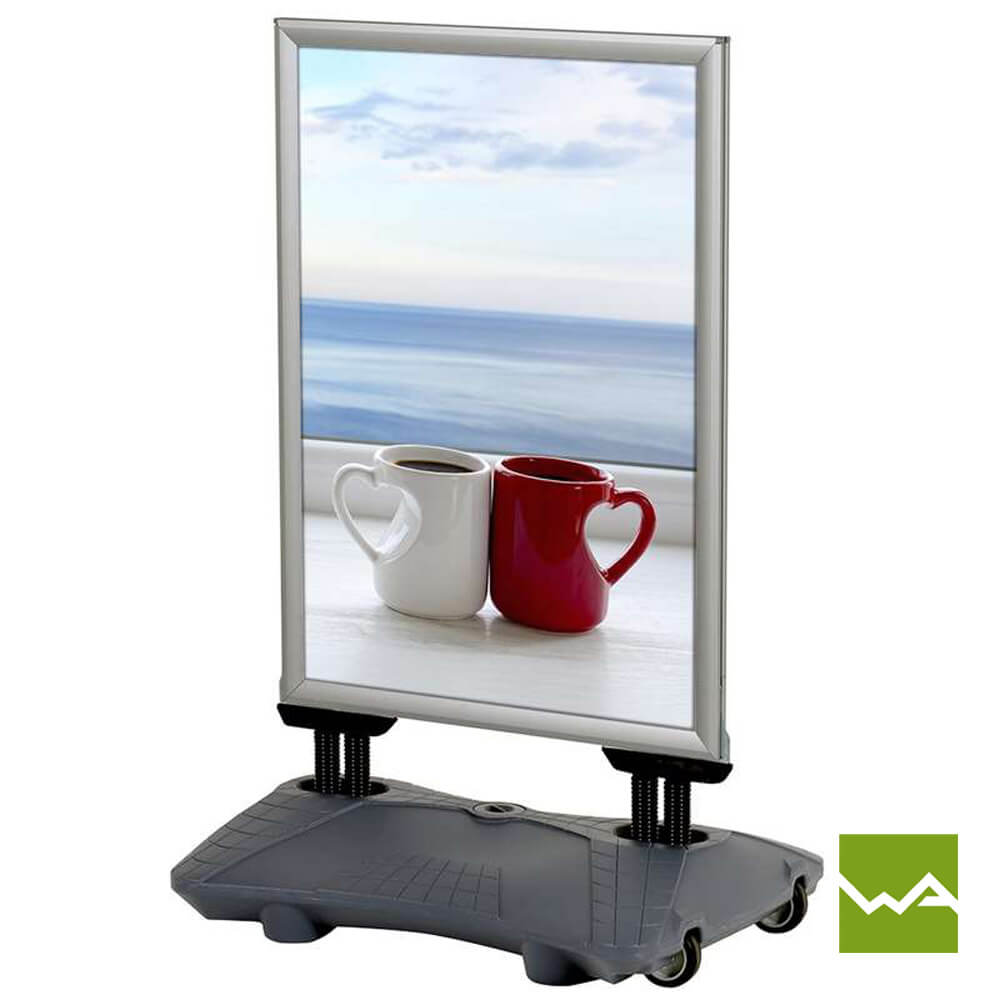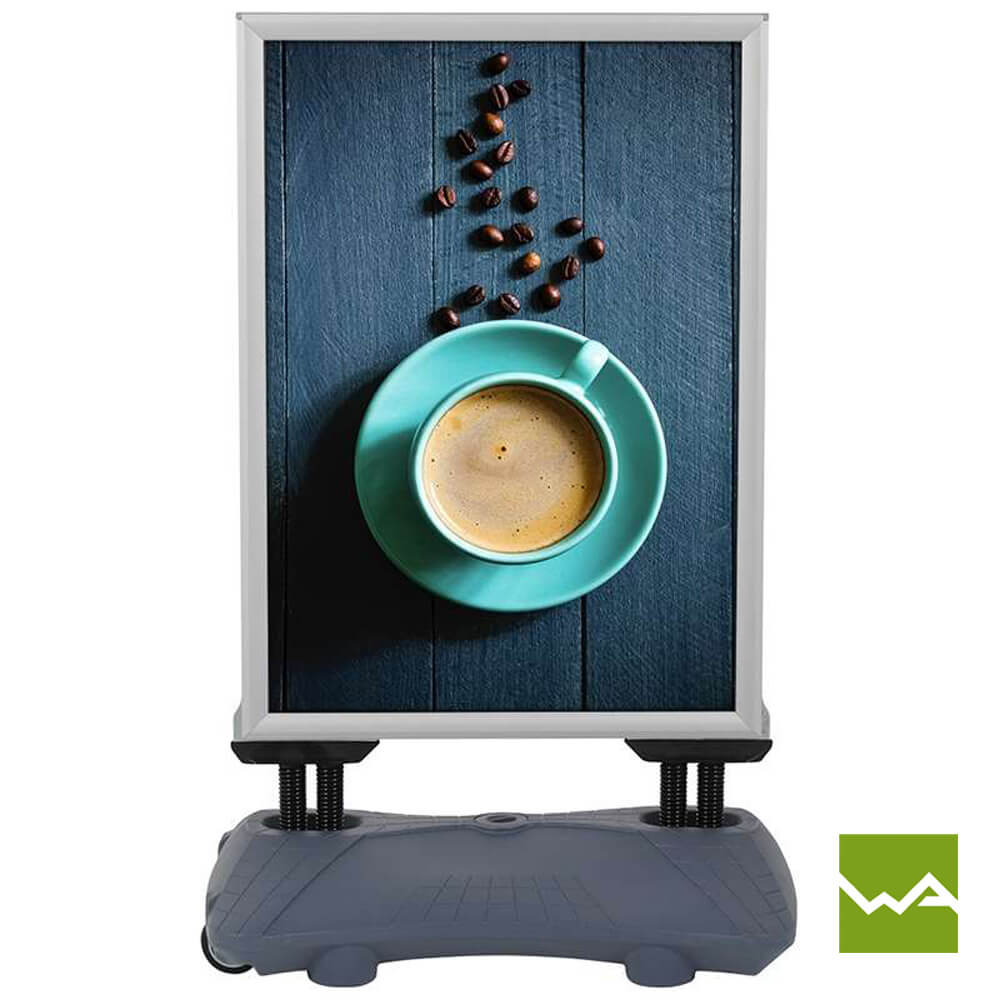 Der Gehwegaufsteller SWING TANK ist in den gängigen Plakatformaten A0 und A1 erhältlich, was Ihnen die Möglichkeit gibt, die Größe des Kundenstoppers an Ihre spezifischen Anforderungen anzupassen. Egal ob Sie großflächige Grafiken oder prägnante Slogans präsentieren möchten, der Kundenstopper SWING TANK bietet genügend Platz für Ihre Werbebotschaften.
