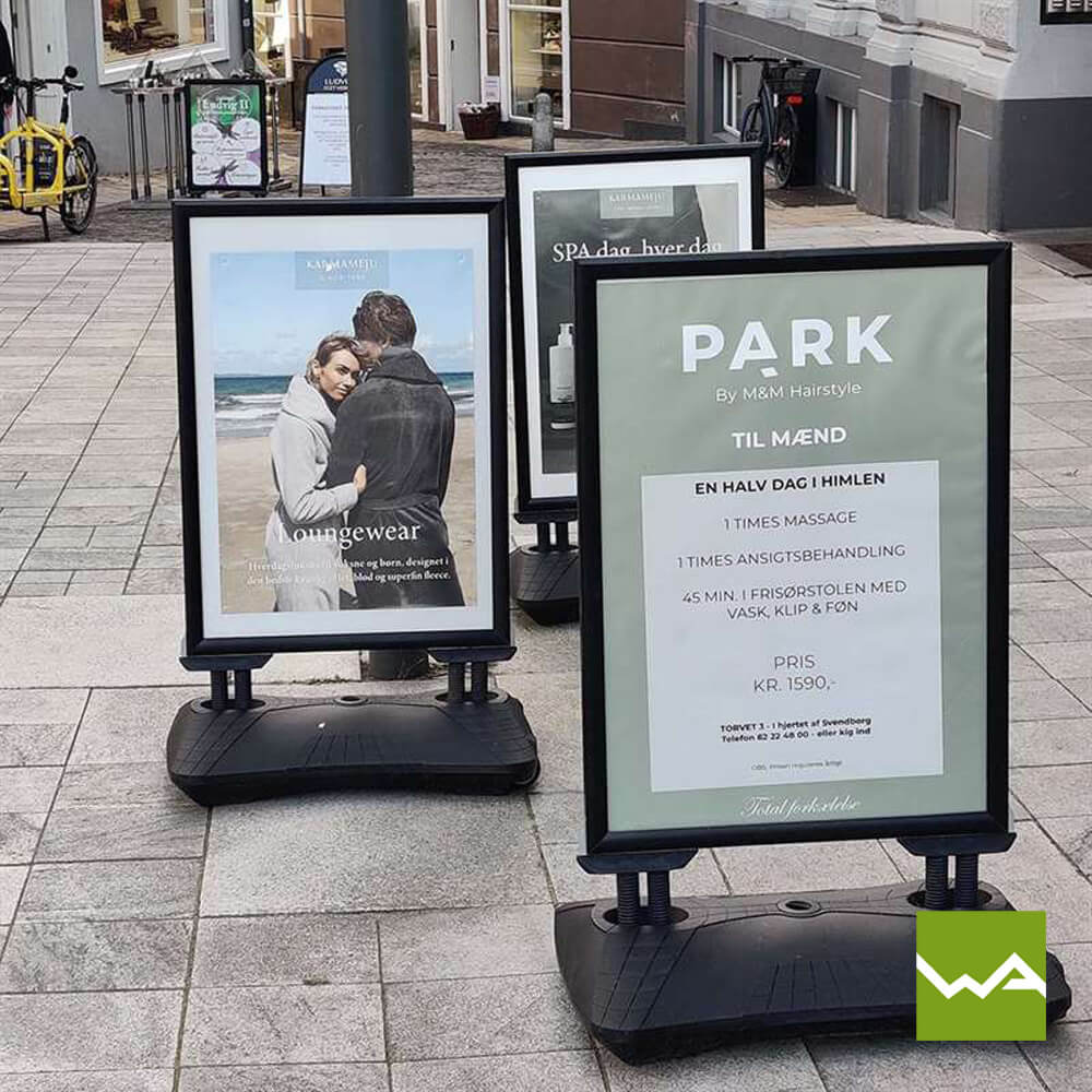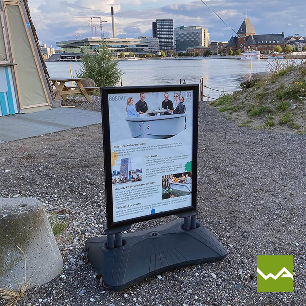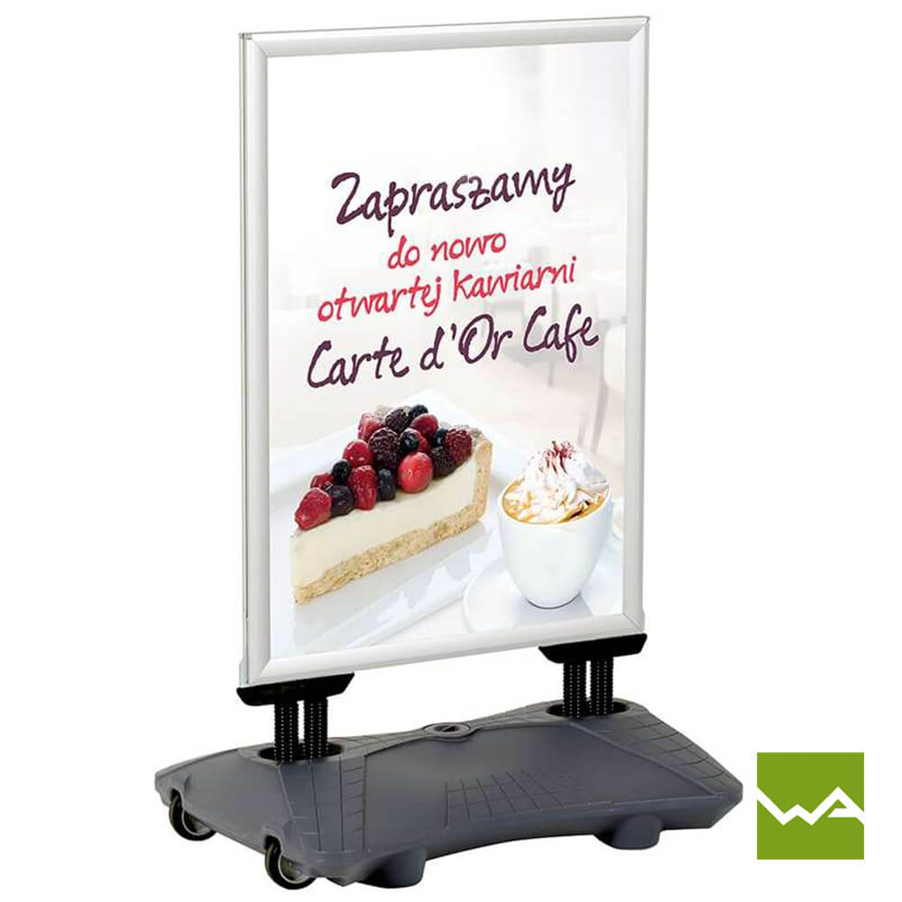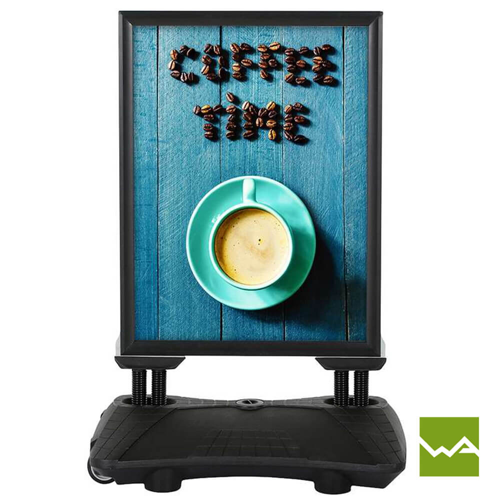 Der Gehwegaufsteller SWING TANK ist in den gängigen Plakatformaten A0 und A1 erhältlich, was Ihnen die Möglichkeit gibt, die Größe des Kundenstoppers an Ihre spezifischen Anforderungen anzupassen. Egal ob Sie großflächige Grafiken oder prägnante Slogans präsentieren möchten, der Kundenstopper SWING TANK bietet genügend Platz für Ihre Werbebotschaften.