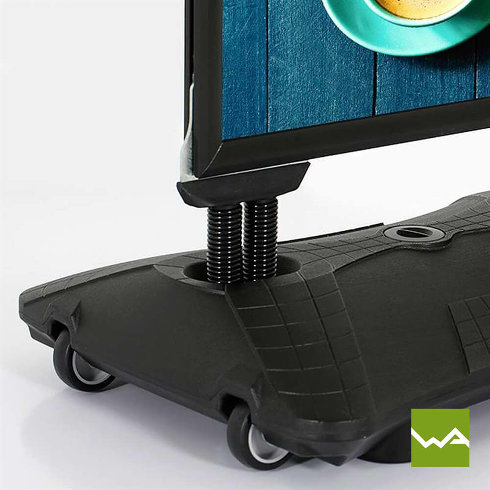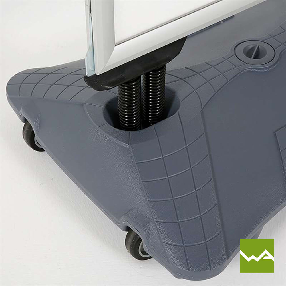 Selbst widrigste Wetterbedingungen können dem Kundenstopper SWING TANK nichts anhaben, dank seines massiven Wassertanks, der für perfekte Standfestigkeit sorgt. Egal ob strahlender Sonnenschein, starker Regen oder stürmische Winde – dieser Werbeaufsteller bleibt stabil und zuverlässig an Ort und Stelle stehen. Die integrierten Rollen an der Unterseite machen ihn zudem leicht zu transportieren, sodass Sie Ihre Werbung jederzeit flexibel platzieren können.