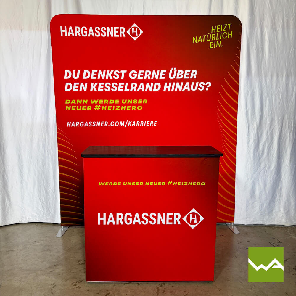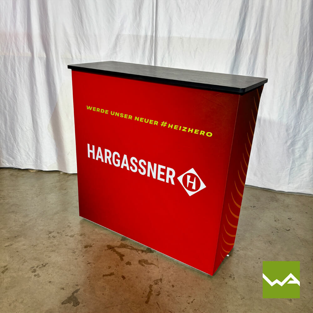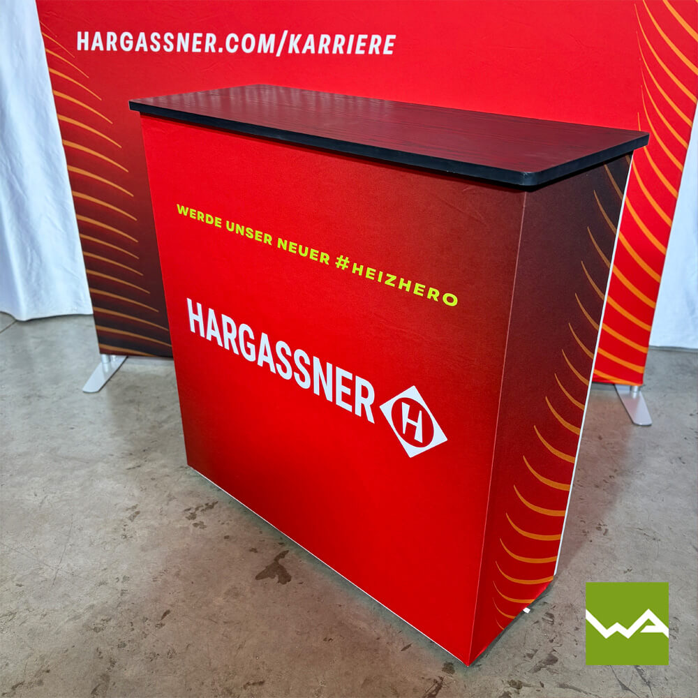 Die Theke Impress vereint Stabilität, Flexibilität und eine hochwertige Optik, wodurch sie sich ideal für Messen, Promotions und Events eignet. Ihr solides Scherengittersystem aus Aluminium mit zusätzlichen Kederschienen sorgt für hohe Stabilität und Langlebigkeit, während das geringe Eigengewicht den Transport erleichtert. Die individuell bedruckte Stoffbespannung wird mittels SEG-Befestigung (Silicone Edge Graphics) präzise und faltenfrei am Rahmen fixiert, was einen schnellen Austausch der Grafik ermöglicht – perfekt für wechselnde Kampagnen oder Markenauftritte.