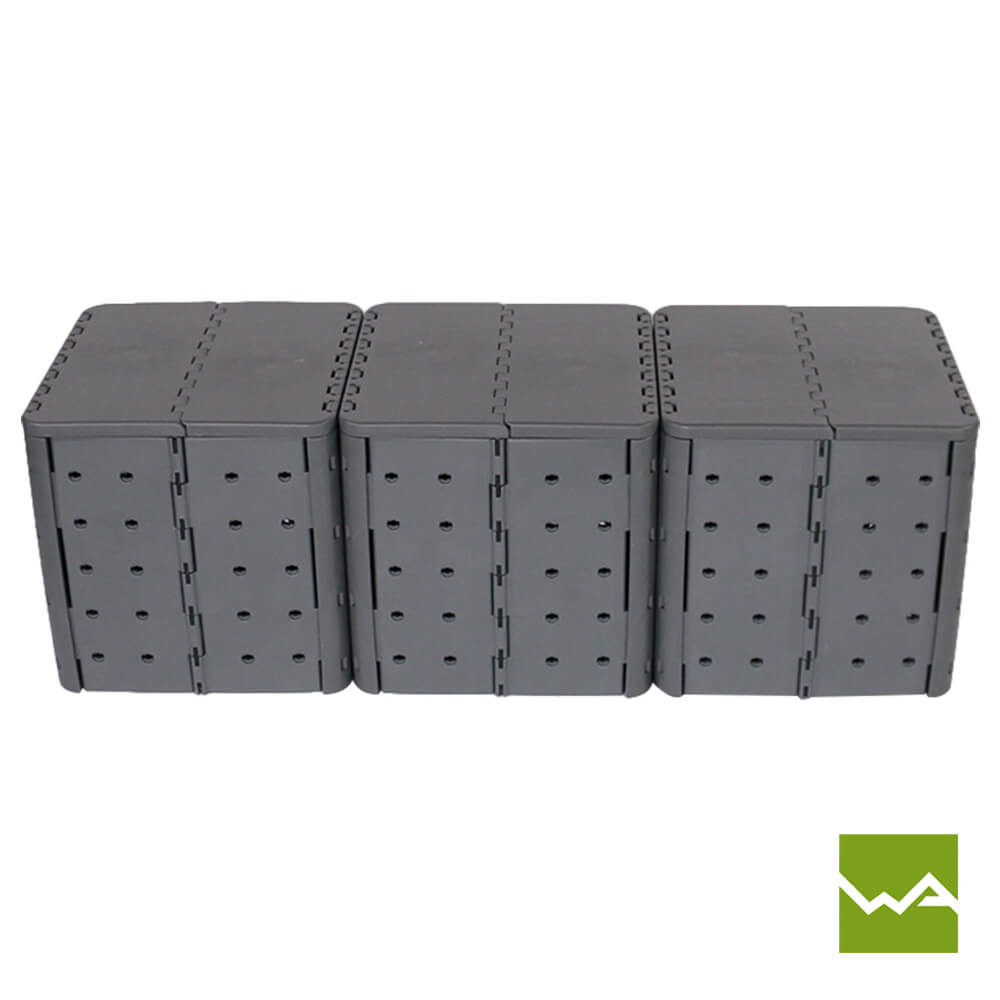 Im gefalteten Zustand misst der Flatcube Sitzwürfel 61 × 40 × 7,5 cm. Diese kompakten Maße ermöglichen eine besonders platzsparende Lagerung und einen effizienten Transport größerer Stückzahlen.