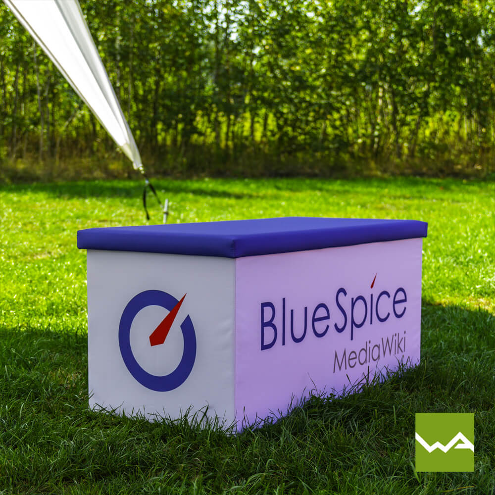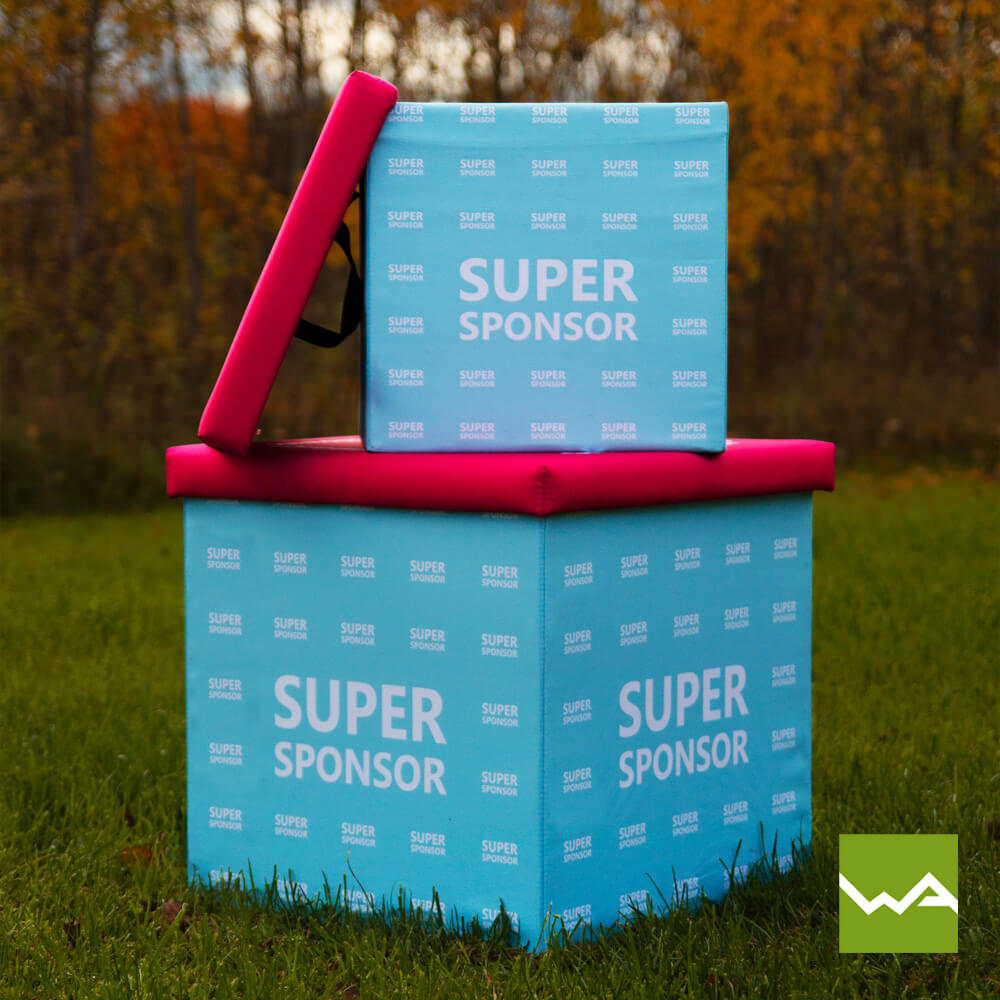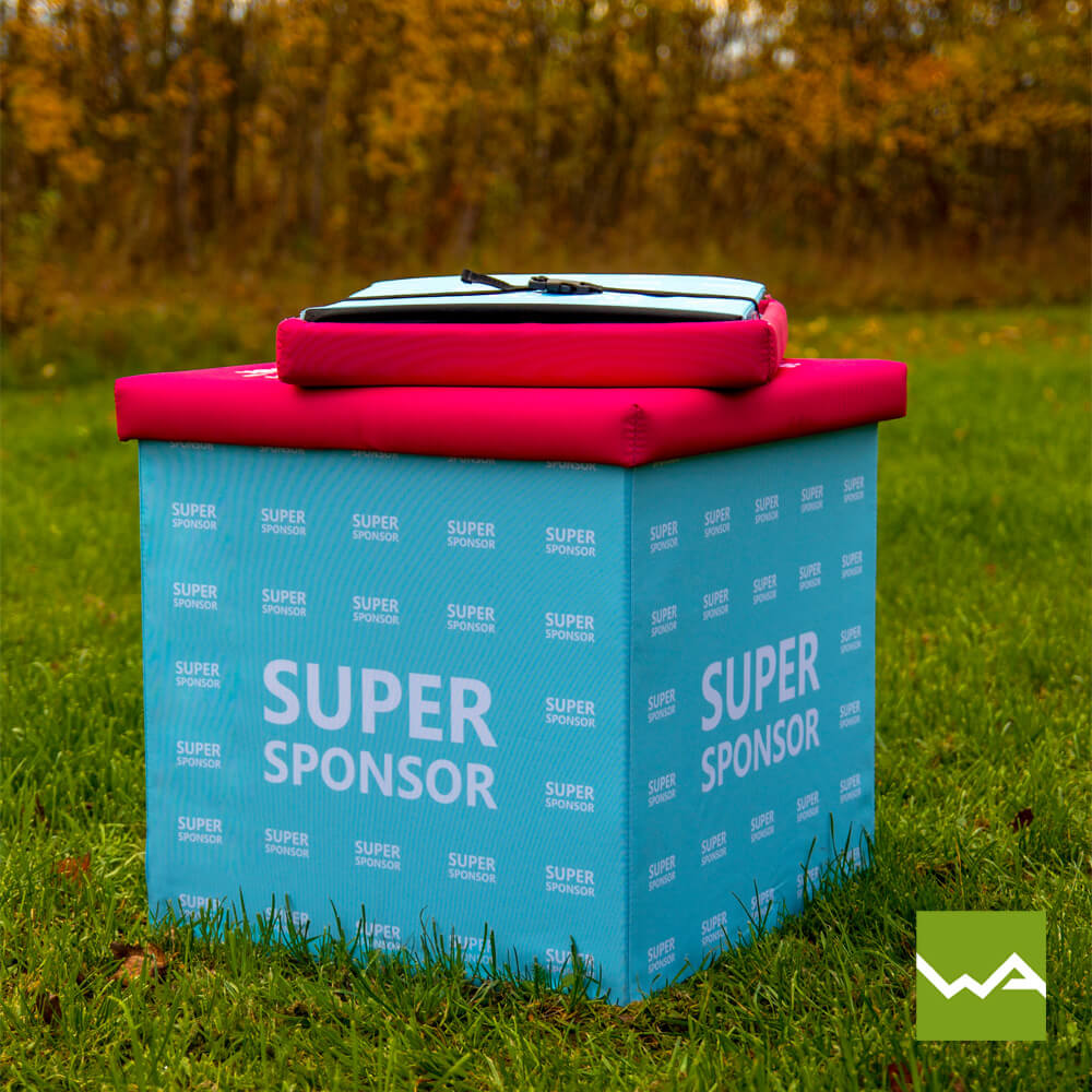 Dank der Kombination aus Sitzfläche, Stauraum und individueller Bedruckung lässt sich der Sitzwürfel mit Stauraum flexibel an Standort und Nutzung anpassen und unterstützt eine ordentliche, professionelle Präsentation.