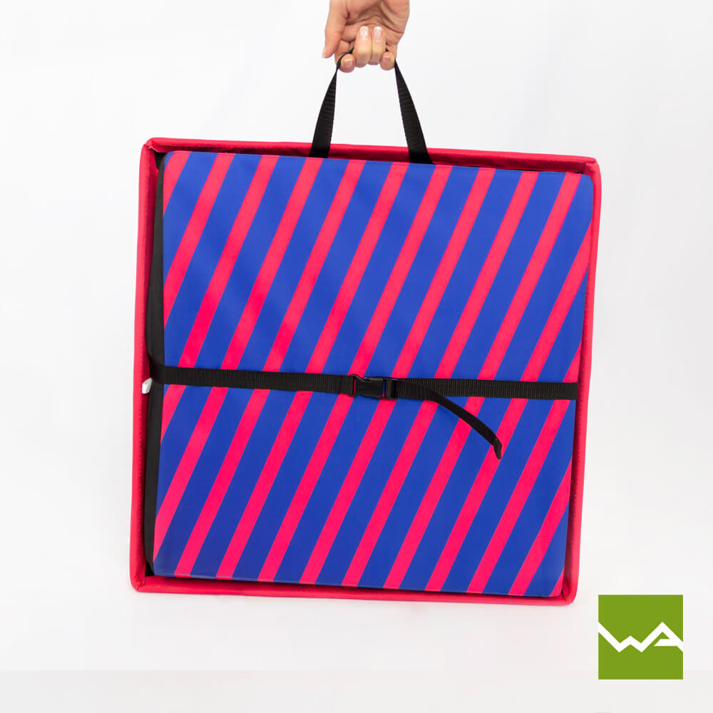 Der klappbare Sitzwürfel benötigt im gefalteten Zustand nur etwa ein Viertel des Volumens eines herkömmlichen Sitzwürfels. Das reduziert Transportkosten und Lagerfläche deutlich und ist besonders praktisch, wenn mehrere Sitzwürfel für Events oder Roadshows benötigt werden.