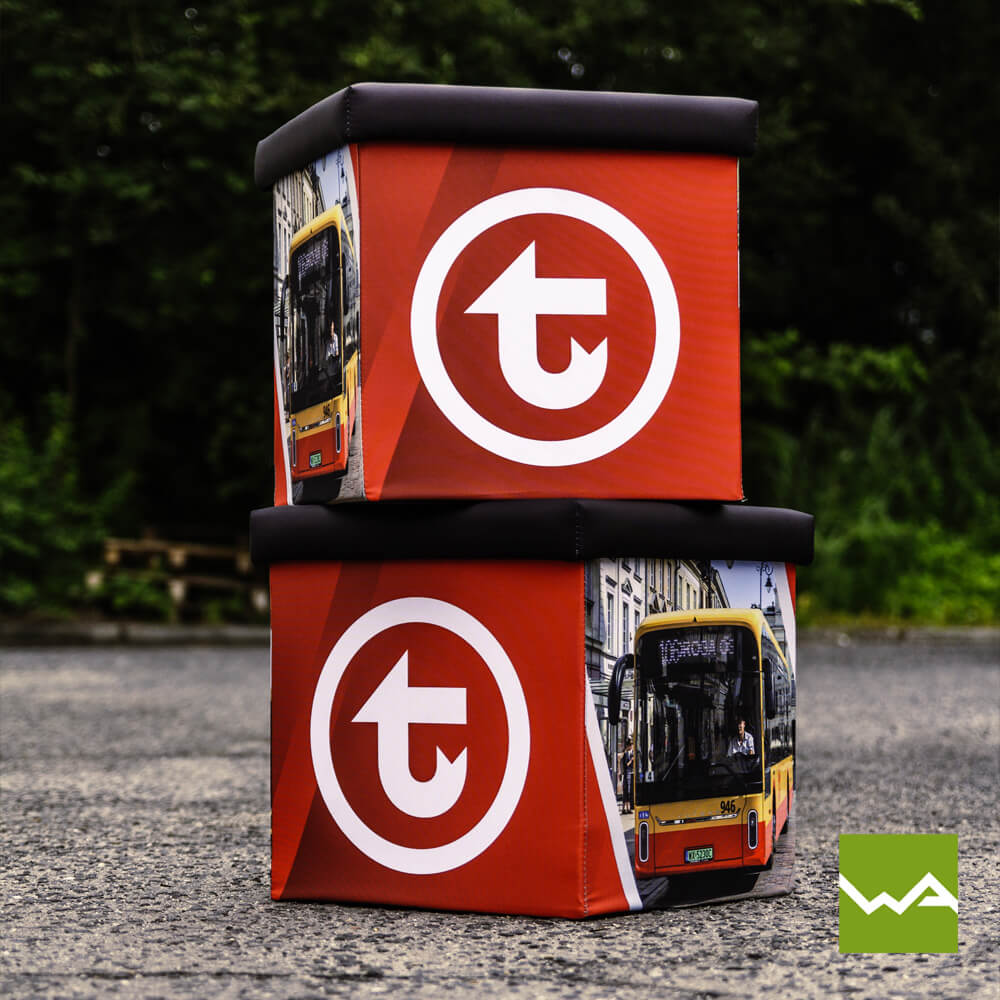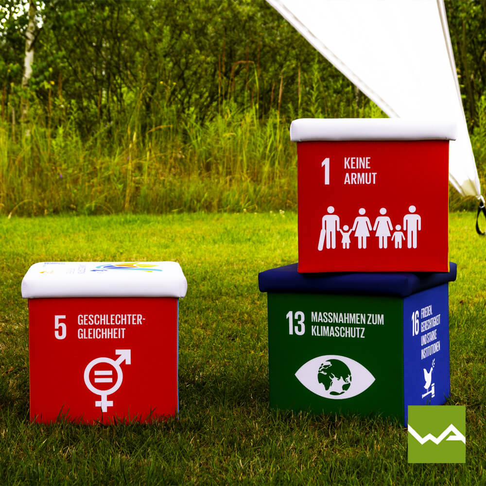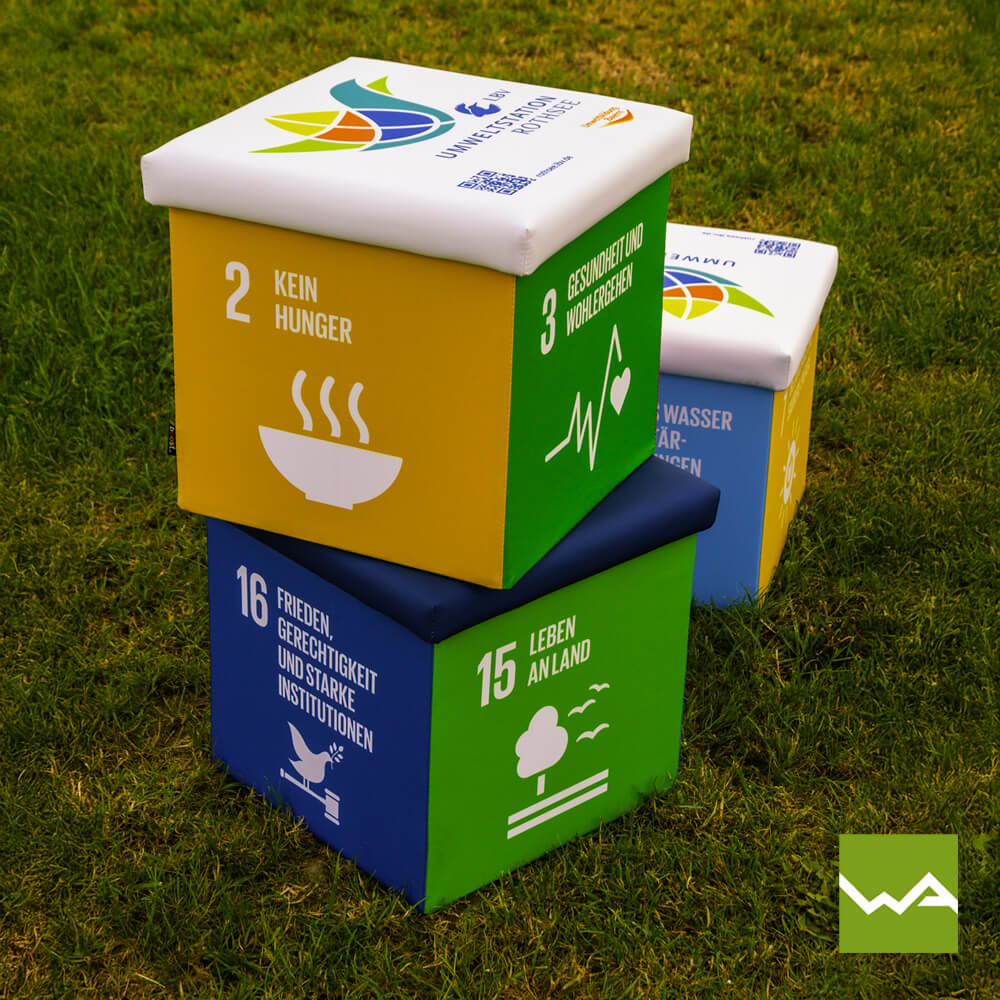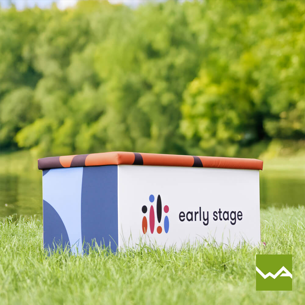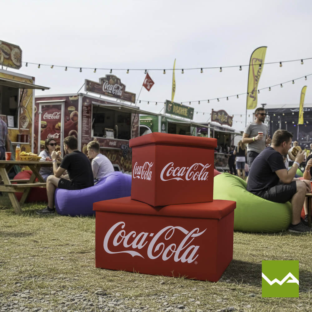 Ein Sitzwürfel mit Stauraum ist ein faltbares Sitzmöbel, das Sitzfläche, integrierten Stauraum und Werbefläche in einem Element kombiniert und sich für Transport und Lagerung platzsparend zusammenfalten lässt.