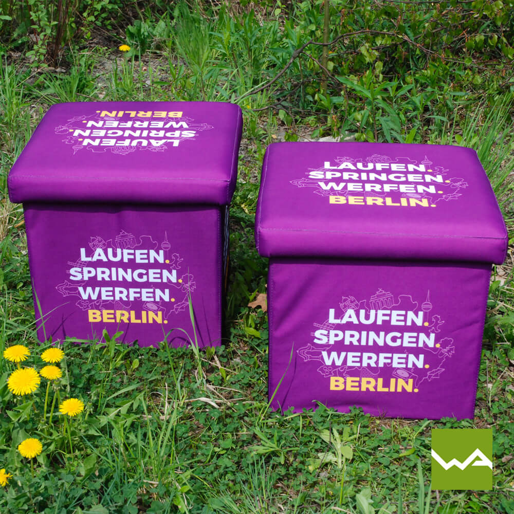 Ja, Sie können den Sitzwürfel mit Stauraum bedrucken lassen, zum Beispiel mit Logo, Slogan oder Fotomotiv. Der Druck erfolgt im hochwertigen Sublimationsdruck, wodurch Farben langlebig, brillant und ideal für den professionellen Werbeeinsatz geeignet sind.