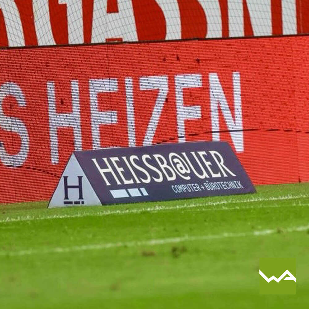 Fußballstadien nutzen dreieckige Schaumstoffbanden für starke Sponsorenwerbung.