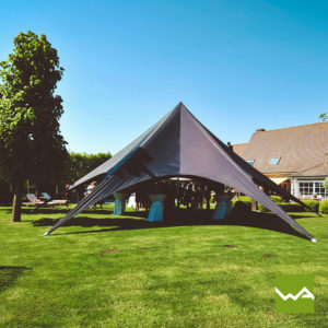 Sternzelte sind die architektonisch imposantesten Eventzelte. Mit Spannweiten von 10 bis 21 Metern überspannen sie große Flächen und wirken durch ihre markante Form besonders einladend und hochwertig. Ob für Catering, Festivals, Motorsport, Roadshows oder Firmenveranstaltungen – ein Sternzelt bietet nicht nur Wetterschutz, sondern inszeniert Markenpräsenz auf höchstem Niveau. Dachflächen und Seitenwände lassen sich vollflächig bedrucken, wodurch aus jedem Sternenzelt ein weithin sichtbares Werbeobjekt entsteht.